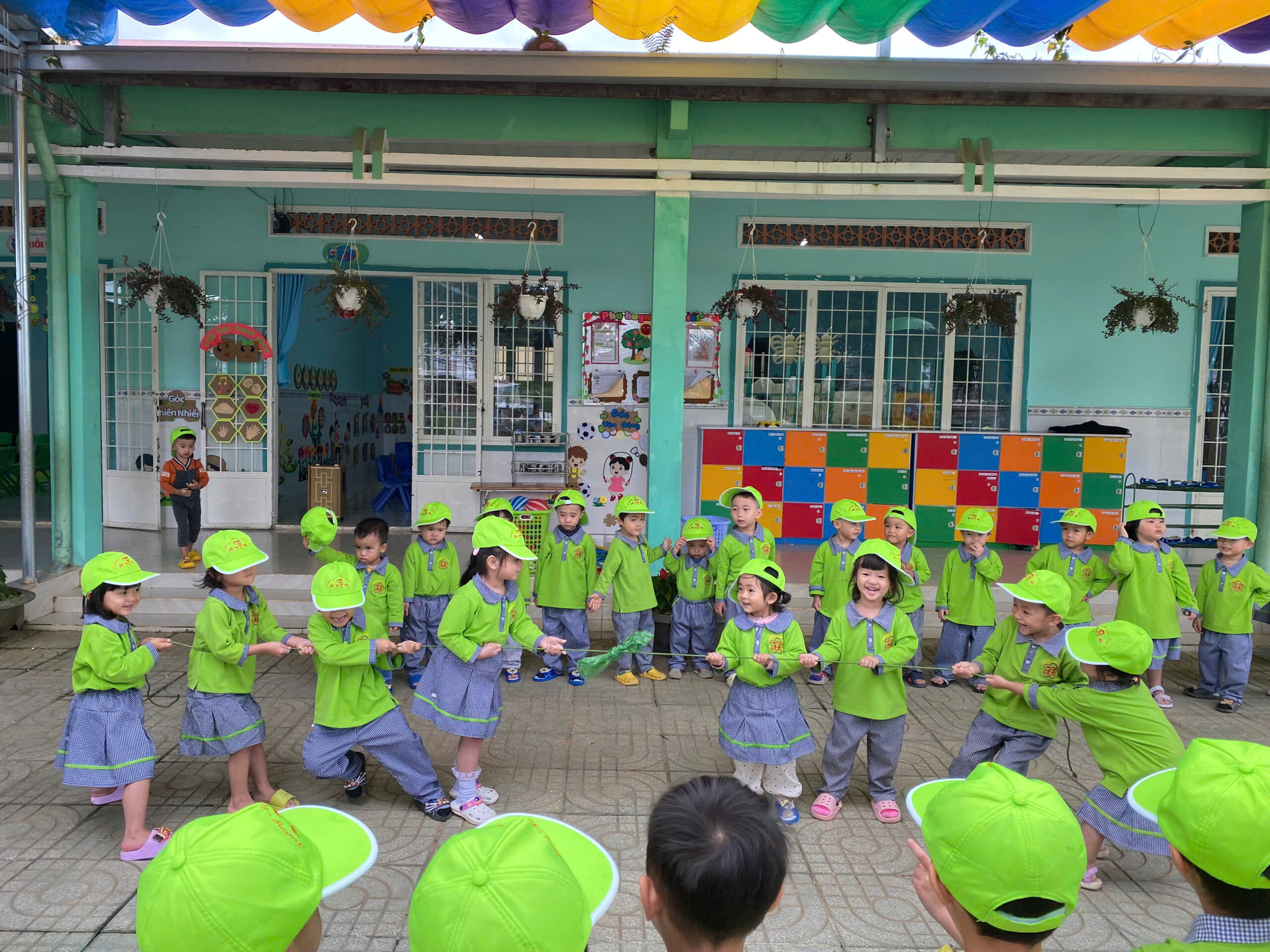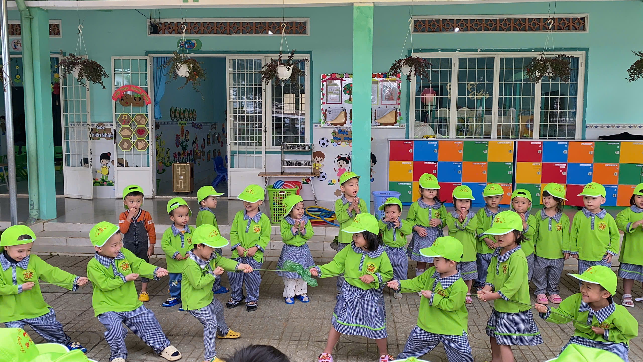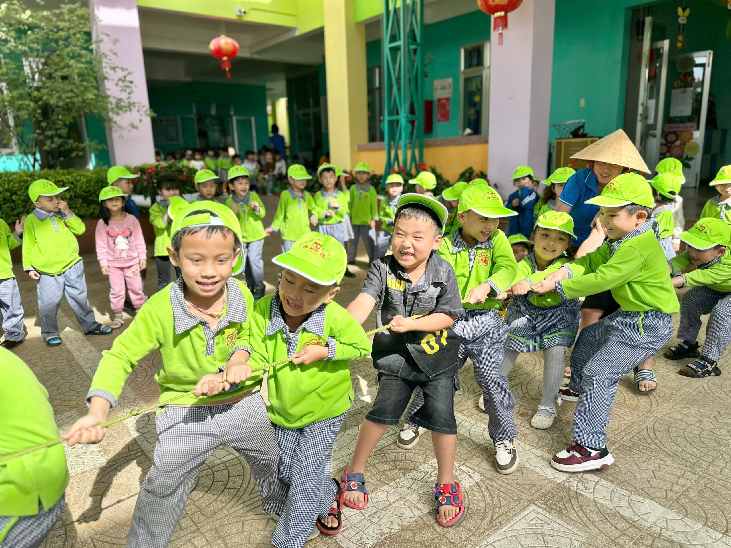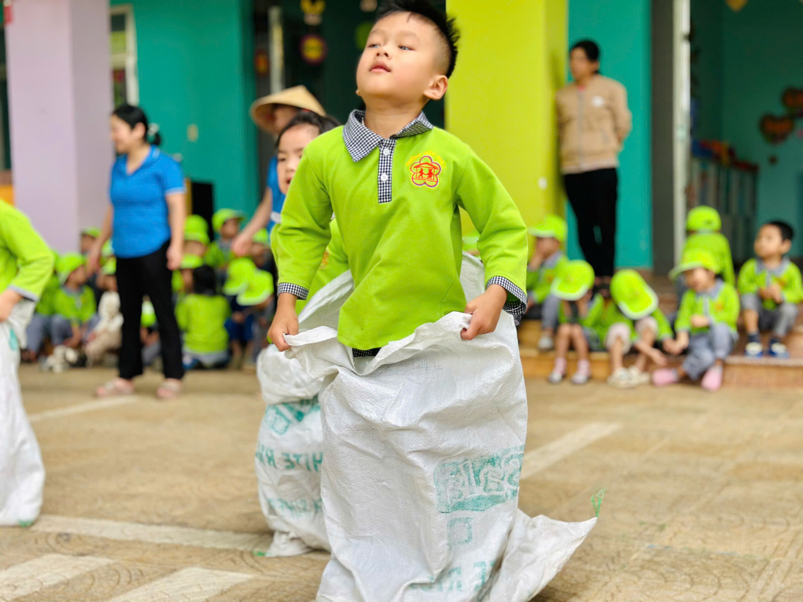 💪 Dưới sự hướng dẫn của cô giáo, các bé được khởi động vui nhộn, tham gia nhiều trò chơi vận động hấp dẫn như: kéo co, nhảy bao bố, chuyền bóng, chạy tiếp sức…